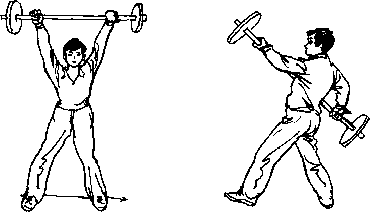 上右脚,转身成正面站立,双手向上方挺举。(图U/-89)