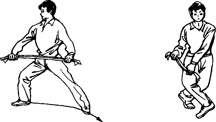 右脚跨出一步,左腿往后绷,变成右弓步,然后猛一转身,同时两手 抱石鼓前推,身体往前倾探,继而上步换为左弓步,作同样的练习。(图 n-i-99)