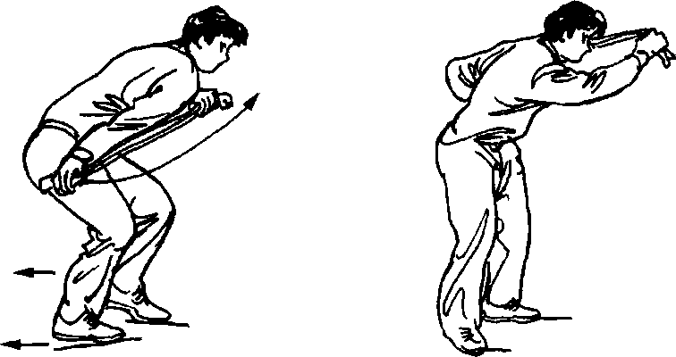 两腿原地猛蹬,右手前弓I,左手后拉,身体前俯,全身协调,以爆发 力抖动腰带。(图