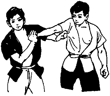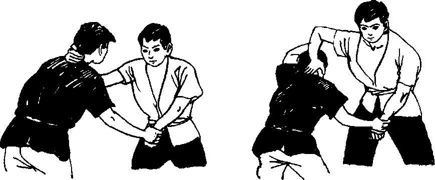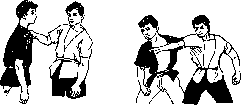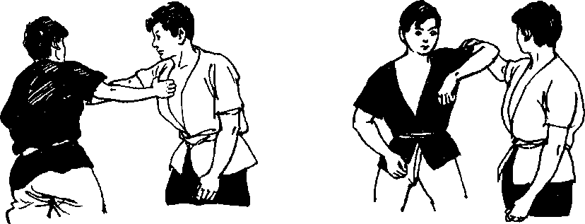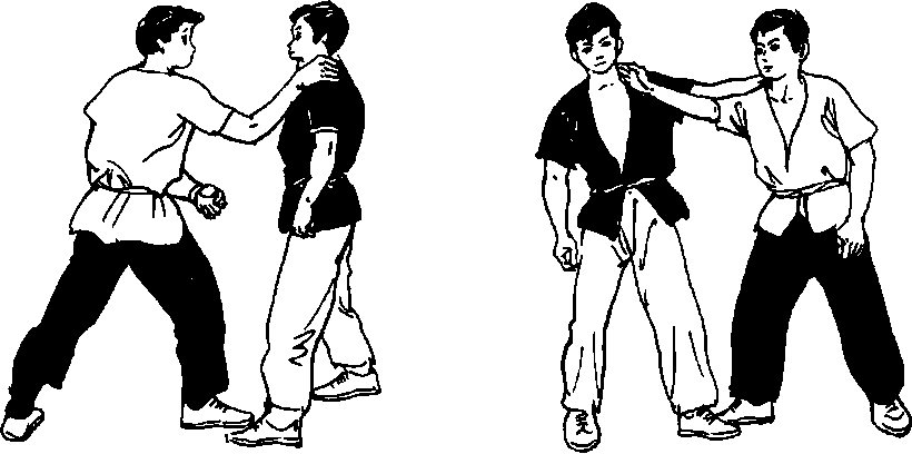 8 .抓领 右手心向下,从对方左肩上抓其衣领,拇指在里,四指 在外,右臂微屈,肘下垂,用小臂抵住对方左肩,以防止转体攻入。(图 n-1-142)