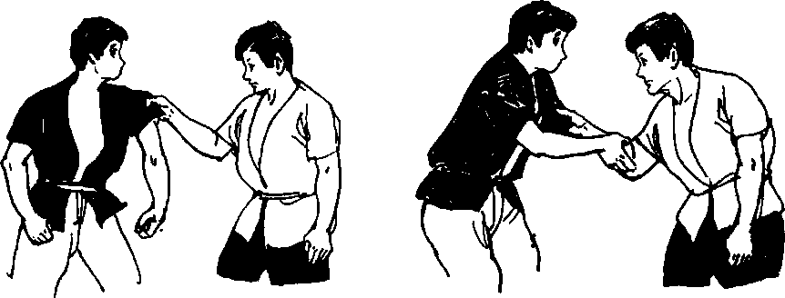 9 .抓偏门 右手抓对方右胸襟,虎口向上,四指在里,拇指在外, 抓把时微屈右臂,肘下垂,抵压对方胸部。(图
