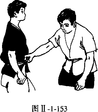 解脱:左手抓对方的袖,向前撑,右手向下方拉对方的右手,即可解 脱。(图『L152)