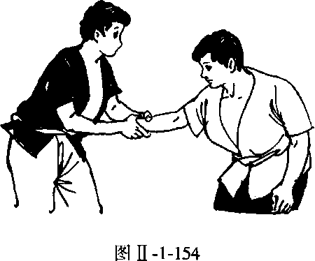 (3)用左臂屈肘,向下,向里,向上,再向外绕转,转到对方右前臂 之上,突然用力向后撤,同时向左转体,可解脱。(图n-i-149)