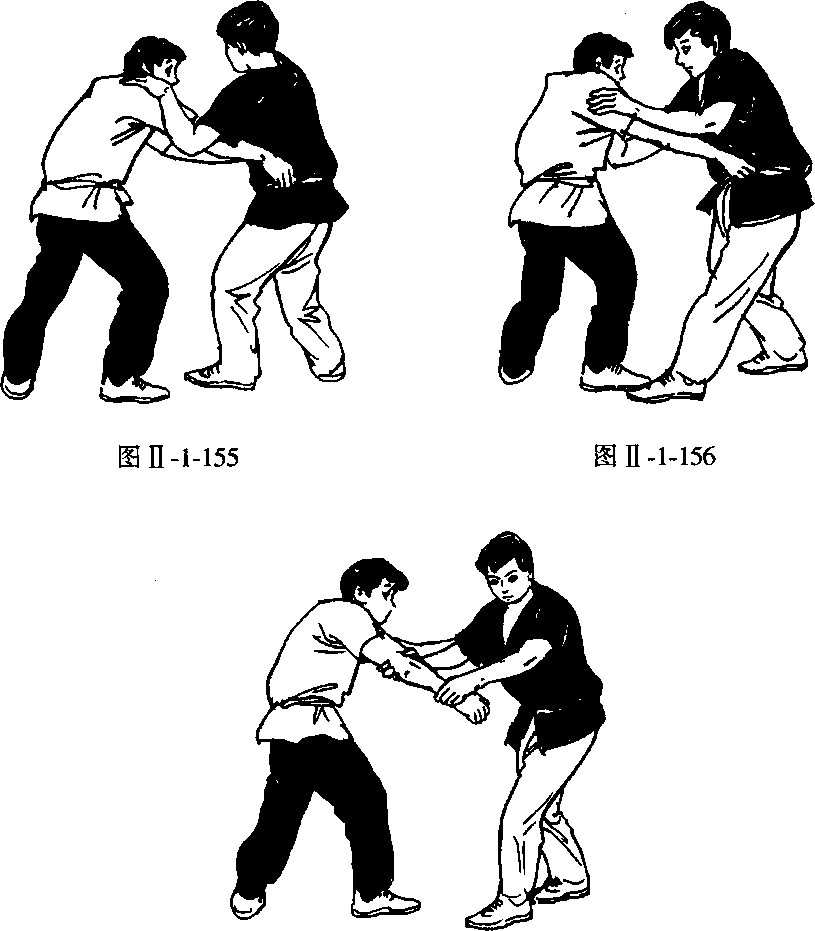 14 .抓后带 右手穿入对方左臂下,手心向着对方背部,拇指在 里,四指在外,抓其后带。(图U-L155)