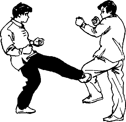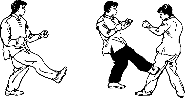 图[-1-48图[-1-48说明:截腿除了主动进攻对方以 外,还可以阻拦对方的腿部进攻动作, 当乙方提腿时,甲方(穿黑裤,下同)即截在其膝部以下位置,就能达到 阻击的目的c (图I?1-48)左脚截腿的要求大致相同,参照使用°