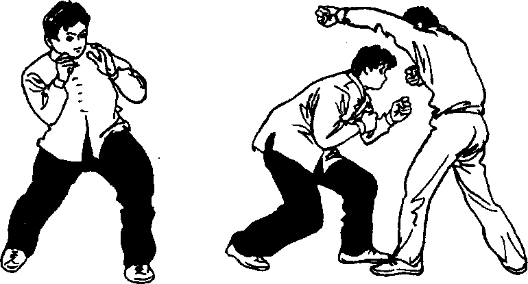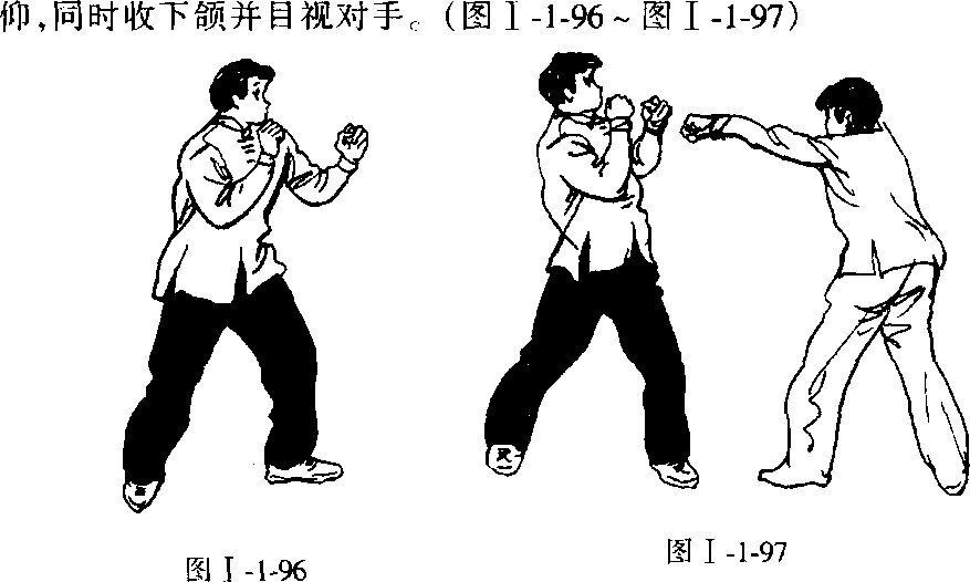 要领:由实战架势开始,两脚不动,屈膝沉胯、重心降低,同时含胸、 收腹并微低头,两手护胸,目视对方。(图I -1-98?图I -1-99)
