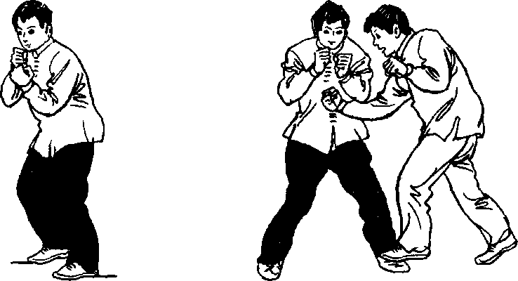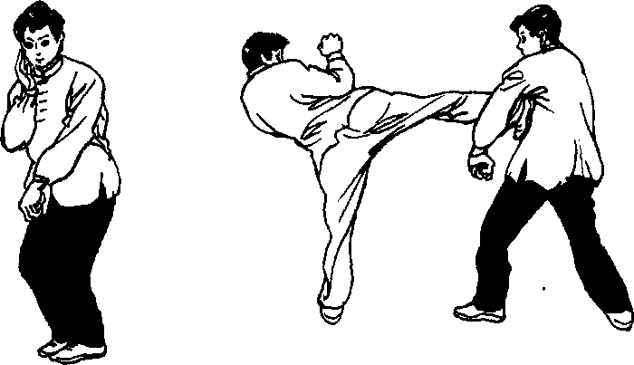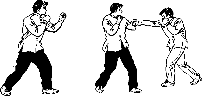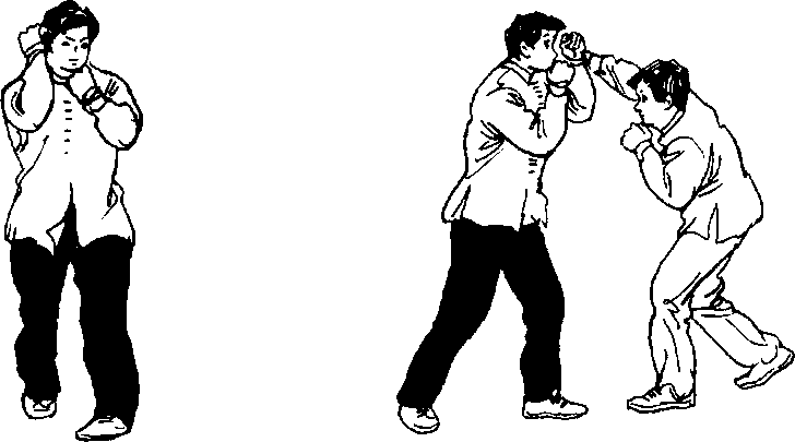 说明:此法主要用于防守乙方的冲拳、摆拳以及鞭腿的攻击,保护 胸部以上部位。