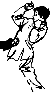 易犯错误与纠正方法:乙方起 鞭腿时,甲方向后逃离,造成反攻时 距离太大,攻击不到位。纠正时,请 同伴一起练习,对鞭腿的攻击,以较 小的力量将其避开。