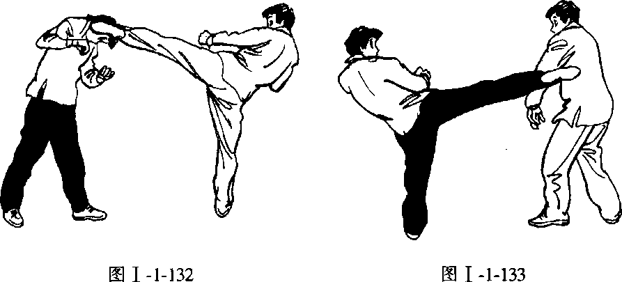 要领:这是一组比较复杂的攻防实战动作。实战中乙方起左鞭腿 踢甲方头部,甲方左闪避开,待乙方左脚落地时,甲方迅速起右鞭腿踢 乙方身体,乙方向右避开,同时向甲方头部右冲拳过来,甲方向下闪避。 乙方欲起左脚踢击,甲方立即提起右脚截阻,截阻之后转身,用左脚向 乙方胸部踹踢。(图图1-1-136)