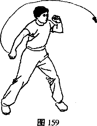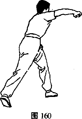 左格斗势,左脚向前上半步的同时,重心向前移至左 脚,向右微扭腰右手向后下挥出。(图158、159)