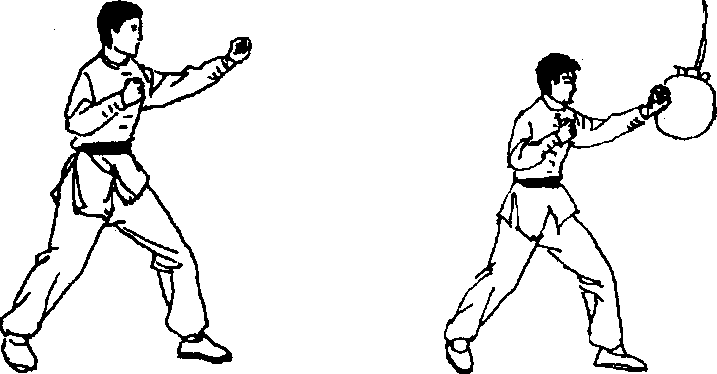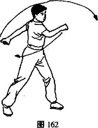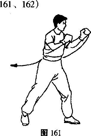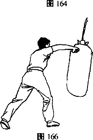 〔练法〕空打练习,练至肩松臂活双手连贯。再分别练 前后手击打沙袋。分组练习,左右手各练3组,每组50次。 (图 165、166)