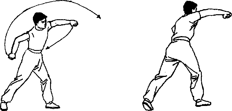 〔要点〕左绕圆挥出,手臂抡圆,大臂带动小臂甩挂, 甩出手挺腕以增大力度。