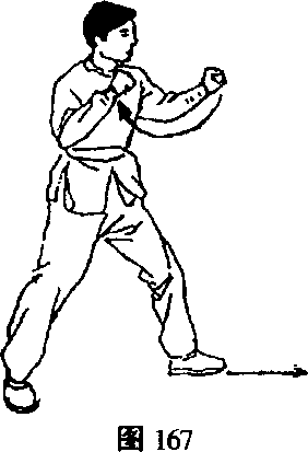 左格斗势,左脚向前移半步,向右微转腰的同时,左手 向内向后摆下,重心前移成左弓步。(图167、168)
