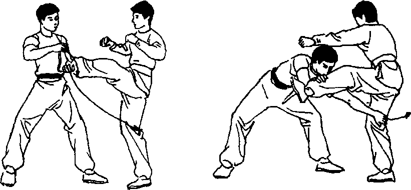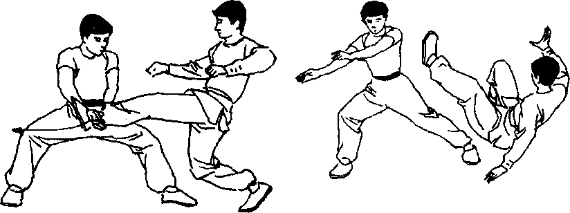 向左猛转体的同时右手向右提拉敌左腿,左手用力向左 后下拨敌颈,将敌摔倒在地。(图438、439)