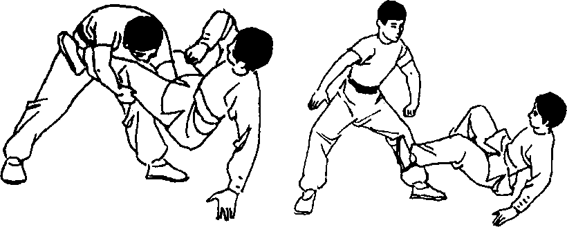 〔要点〕抱腰要紧,上提拉腿与左拨压颈配合协调,绊 腿后部站稳。