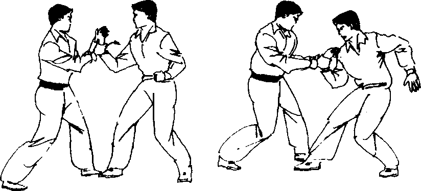 〔要点〕双手大鱼际贴紧敌掌背,小指切压敌手腕内侧, 双手向怀中拉带后借俯身之力。