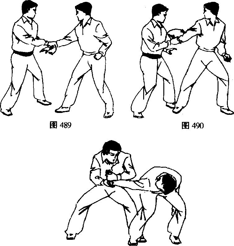 右手虎口向前抓握敌左手腕。(图489)右手外旋手臂 扭敌手臂使之成反手,掌心向上。(图490)