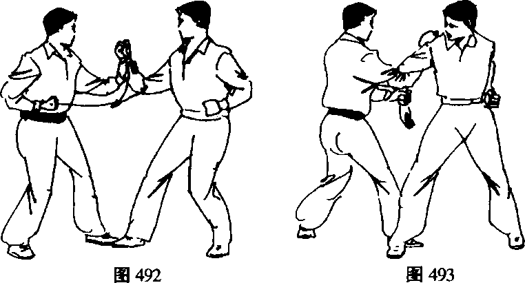 上右步将敌手拉压于右腋下,右手以小臂拇指侧由右向 左挑打敌肘关节窝使敌手臂屈肘。(图493)