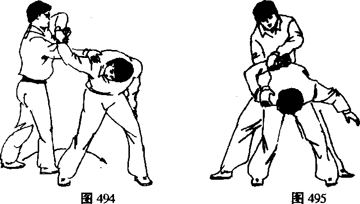 敌臂使敌右臂折屈于其体右后侧。(图494)