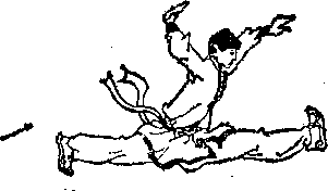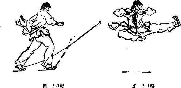 左预备姿势站立。左脚蹬地跳 起,右腿屈膝向上摆起,身体腾空 (见图5—190〉,在空中,右腿挺膝 伸直向前上方蹬击,同时左腿向后 上方伸出,两脚尖勾起,力达脚跟。眼看前方(见图5—191)。