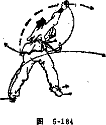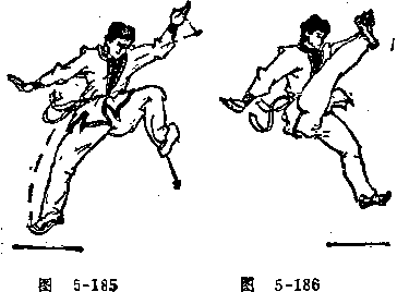 左预备姿势站立。右脚向前上步,同时身体左转(见图5- 182),上动不停,左腿屈膝向上摆起,隨即身体右转,同时右脚 蹬地向上眺起,身体腾空,在空中,左腿挺膝伸直向左侧蹬击, 脚尖勾起,力达脚跟,右腿向上提摆左脚收至裆部,臍面绷直, 两臂屆肘向上摆起。眼看左方(见图5—183)。