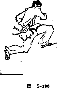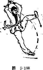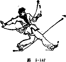 左预备姿势站立。右脚向前上步,脚尖外展,左腿微屈, 脚跟离地,上体后仰,右臂向下、向后摆动(见图5-187),右 脚蹬地跳起,同时左腿向右上方摆起,两臂上摆,两手在头上 击响,上体向右转动,身体腾空(见图5-188),右腿向上、向右 外摆,两手先左后右击拍右脚面,左腿收控至身体左侧,眼看 击拍方向(见图5—189〉。