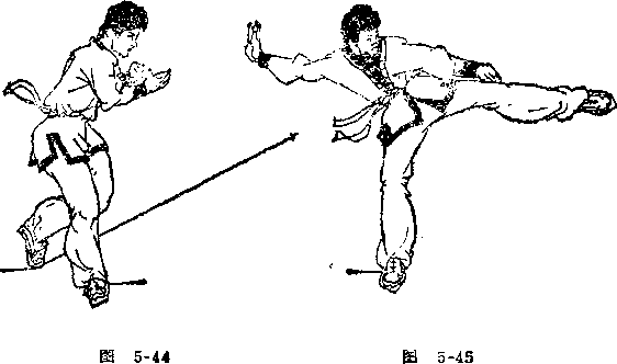 左预备姿势站立。重心前移,右脚向前上半步,脚尖外 M,左脚跟离地,两腿微屈,两手摆至胸前(见图5-44),随即 上体稍右倾并右转,同时左腿挺膝伸直,向左侧穿击脚面绷 直,脚掌朝后,力达脚尖。眼看左侧方向(见图5-45)#要点:侧倾与穿击要同时,脚高不过胸,穿击要快,回收 要疾。实战用途:穿枪脚属远距离进攻性腿法,主要攻击对方 腹、肋部位。