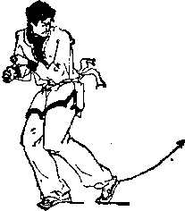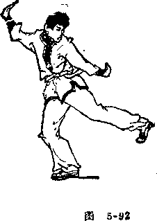 左预备姿势站立。右脚尖外展,身体右转,上体稍前俯, 左脚尖里扣,脚跟离地,两手摆至胸前(见图5-91),随即右手 向头上摆起,左手摆至身后,同时右腿支撑,左腿微屈向后蹶 击,脚尖勾起,力达脚跟。眼看后下方(见图5_92)。要点:支撑腿微屈,蹶踢要突然、迅猛9 实战用途:主要攻击对方膝部或胫骨*