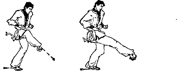 左预备姿势站立,重心前移,左腿支撑,右腿JB膝向上提 起并外旋,脚内侧朝前(见图5-93),随即右腿挺膝伸直向斜 下方蹬击,脚尖勾起,力达脚跟,眼看前下方(见图5-94)。 要点:支撑腿微屈,蹬击的高度和远度要根据对方的情况而定最高不超过膝部。实战用途:此腿法可直接攻击对方膝或小腿,也可在对 方进玫时,迅速起腿拦蹬其胫骨。