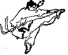 起'右脚蹬地向前上方跳起,身体膺空,在空中,左膝向前上方 顶击,力达膝盖部位。眼看前方(见图5-176)。