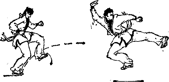 实战用途:对方受到我猛烈进攻时,在其后倒或重心不 稳之际,跳起攻击对方上部或中部。