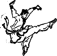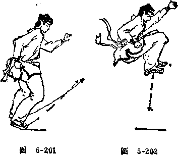 左预备姿势站立。右脚向前与左脚并步(见图5-201), 随即两月却跨:也地跳起,两腿屈膝向上摆起,身体腾空(见图5- 2。2),在空中,右腿挺膝伸直向下蹬击,脚尖勾起,同时上体前 俯,左腿收控至胸前,脚面绷直,眼看下方(见图5-203)。