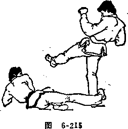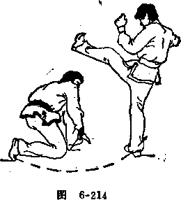 对方用左腿进攻我身体中、上部时,我两腿弯曲,重心下 降,上体前俯闪防(见图6-214)o随即身体侧倒,右腿伸直 扫击其右腿跟腱处(见图6-215)o要点3侧倒时上体要保持一定的紧张,扫击动作要迅猛.
