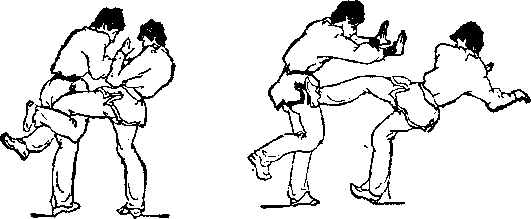 我向前进步,右手抓拉对方左手腕,左手封拦其右臂(见 图6-421),随即右腿向前摆动后,立即屈膝向后,向上用大小 腿后面夹捆其左腿,同时右手松开与左手向前推击对方胸部 (见图6-422),我右脚下落,两臂迅速伸直猛推对方,将其摔 倒在地(见图6223)。