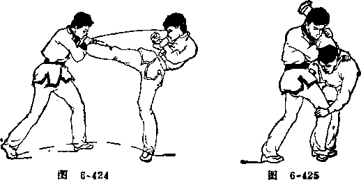 对方用右腿进攻我上、中部时,我上体右倾,两手抓住对 方右腿(见图6-424),随即右脚迅速向前上步踩对方左脚面,