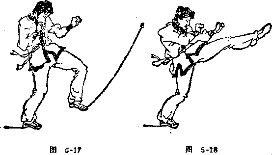 左预备姿势站立。右腿支撑,左腿屈膝提起(见图5-17), 上体稍后倾,同时左腿挺膝伸直,掷面绷直,向左上方弹 击,力达脚面。眼看进攻方向(见图5-18)0要点:右腿支撑要稳,反弹腿外旋,尽量使脚面朝左,动 作要脆快有力。实战用途:此腿法分高击和中击,高可攻击对方头部,中 可攻击其肋部。