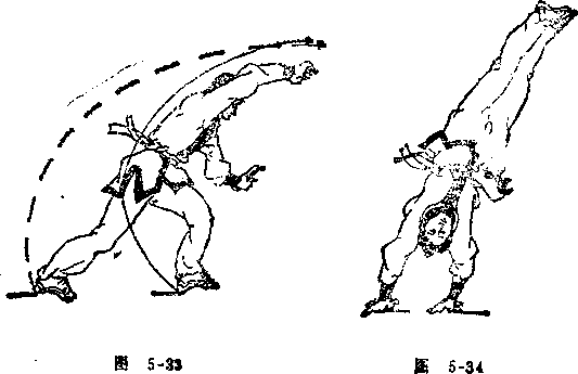左预备姿势站立。左腿弯曲,右腿伸直,上体前俯,两手 向前摆动(见图5-33),右腿向后上方摆起,左手在前下方撑 地,随即右脚蹬地向上摆起,以肩、头带动向左转体,当左脚离 地后,右手在左手前稍偏左撑地,这时左腿要迅速与右腿并 拢,使两脚向斜上方摆击,脚面绷直,脚尖朝斜上方,力达脚 尖。眼看斜上方(见图5-34)。要点,两腿向上摆动时要收腹提腰,快速并拢夹紧。两 手推撑要有力°实战用途:此腿法又名倒上梧桐°主要攻击对方面 部。