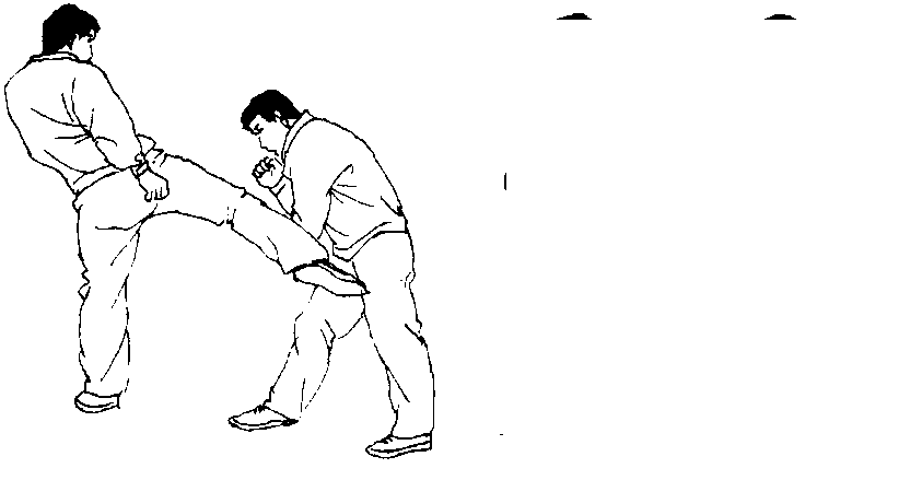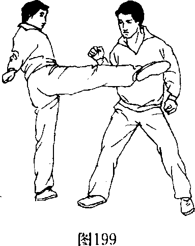 ①甲低侧弹腿攻击乙裆部,乙向左下格挡防守,甲待乙左 臂收回时,右脚点地又起侧弹腿攻击乙腹部,乙收腹同时向外 哼气(图 198,199)。