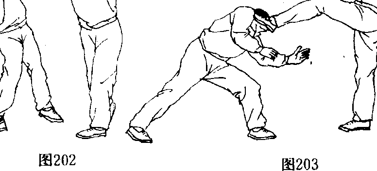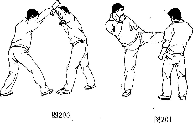 ②甲用右手由上向下攻击乙面部,乙上架防之,甲收手同 时用左侧弹腿攻击乙腹部,乙向外哼气(图200.201)o