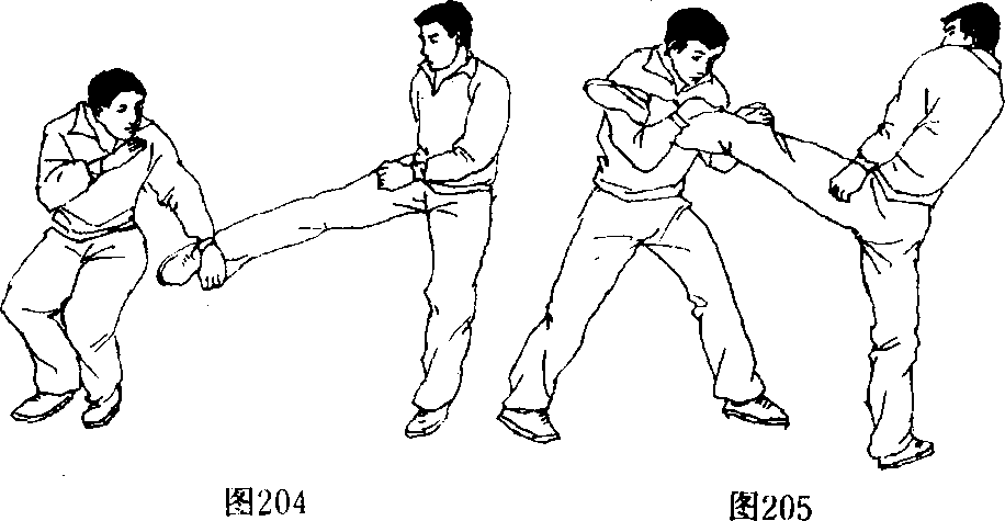 ④乙用右低侧弹腿攻击甲下猿,甲收前腿,同时用前手下 格来脚。乙右脚在身体右前方落施后,右侧弹腿马上攻击甲上 盘,甲用后手将来腿接住(图204、205)。甲松手放开来腿,乙 还用以上方法攻击甲。如上反复数次为一组。
