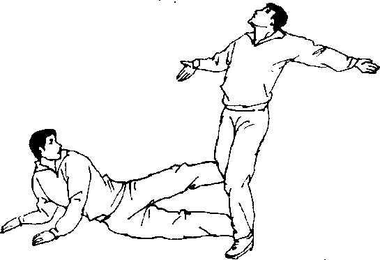 [分析]甲在倒地后要静而待之,待乙进入甲进攻的范围 内后要准确、快速有力地进攻。否则,很难达到踢倒乙方的目 的。