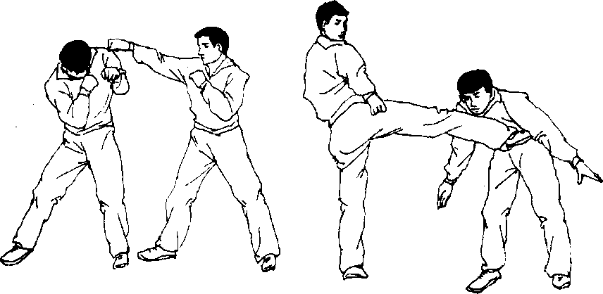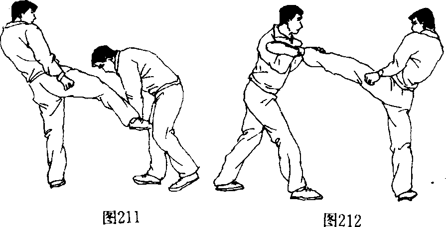 时,乙用右侧弹腿反击甲胸部,甲用左臂阻挡(图209、210)。
