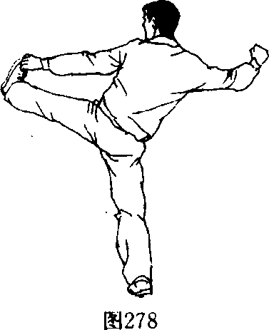 (一)里合腿的基本技术左脚在前、实战步。左脚尖上勾内扣,由左经上向右侧弧 形踢出,上体随之右转90。左右,左脚落于体右侧前方,目视 前方(图278) o[要点]出、收腿要快,身体动作要协调,用力顺势。[用途]攻击对方中、下盘。[易犯的错误及纠正方法]里合腿速度慢,其主要原因是没有借身体转动的力。初练 者腿不要求踢的过高,要求以身带腿。做到:先转身再踢腿。落地后上体转动约四分之一。