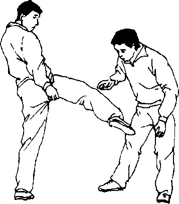 [要点]乙被踹时,膝关节和大腿要紧张。 [作用]提高大腿的抗击打能力。