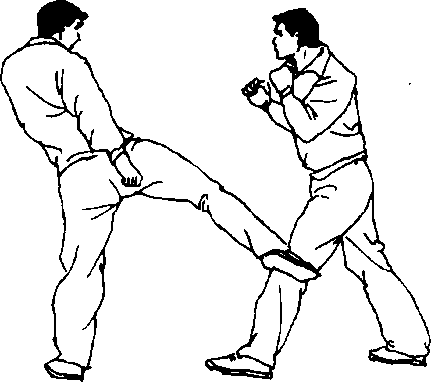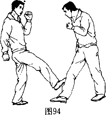 [动作2]乙右(左)腿在前,实战步站稳。甲用丁腿攻击乙 小腿(图94)。甲要由下向上排踢乙小腿。