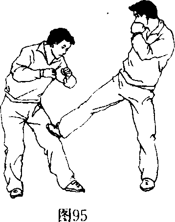 "[动作3]乙左(右)腿在前,实战步站稳。甲用低侧踹腿踹 乙大腿前部(图95)。甲要由下向上或者由上向下排踹乙的大 腿前部。