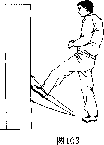 (1)练习者用正丁腿踢柱子或大树,踢的高度由低到高,最高不过腹部(图103)。也可用低侧丁腿踢柱子或大树。可以采用左右各踢一脚的方法。