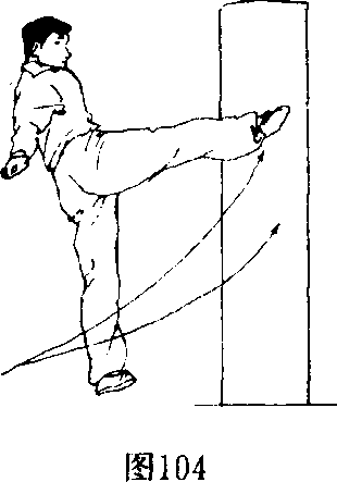(2)练习用横丁腿踢柱子或大树踢的高度同裆或腹部即可(图104)。在柱子上划上点进行练习。