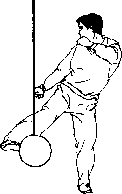 二他甲乙内甲乙丙甲乙丙甲乙内二他甲乙内甲乙丙甲乙丙甲乙内(3)用布缝制一个球约排球大小内装棉花破布吊在空中。练习者用各种丁腿踢球(图105)。