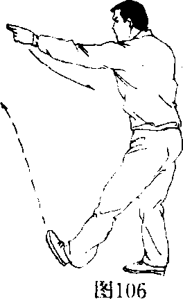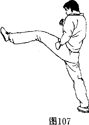 图105图105(4)练习者用左丁腿向前踢出同时穿左掌随即左脚变正踹踹出同时左手收回(图10607)腿法第二次进攻可踹树或吊起的球。